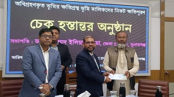 সুনামগঞ্জে অধিগ্রহনকৃত ভূমির ক্ষতিগ্রস্থ ২৬ ভূমি মালিককে ক্ষতিপূরণের ১২ কোটি ৭৬ লাখ ৪৬ হাজার ৬৩৯ টাকার চেক হস্তান্তর করা হয়েছে। রোববার (২২ ডিসেম্বর) দুপুর সাড়ে ১২ টায় সুনামগঞ্জ জেলা প্রশাসকের