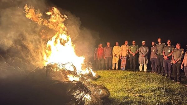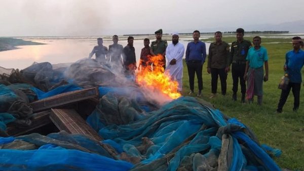 টাঙ্গুয়ার হাওরের বিভিন্ন এলাকায় অভিযান চালিয়ে ৩ হাজার ৫০০ মিটার রিং চাই, এক হাজার মিটার কোনা জাল ও এক হাজার মিটার কারেন্ট জাল জব্দের পর পুড়িয়ে ধ্বংস করেছে ভ্রাম্যমাণ আদালত।