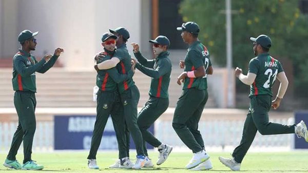 অনূর্ধ্ব-১৯ এশিয়া কাপে টানা তিন ম্যাচে স্বাগতিক আরব আমিরাত, জাপানের পর আজ শ্রীলংকাকে হারিয়ে গ্রুপ চ্যাম্পিয়ন হয়ে সেমিফাইনালে বাংলাদেশ। বুধবার ডিসেম্বর) (১৩ দুবাইয়ের আইসিসি একাডেমিতে শ্রীলংকাকে ১৯৯ রানে থামিয়ে ৫৫