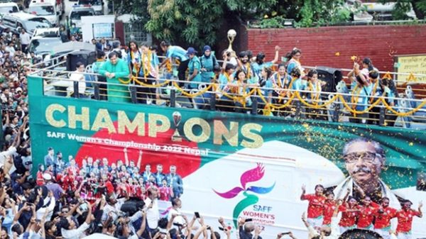 সাফ চ্যাম্পিয়নের ট্রফি নিয়ে দেশে ফিরেছে বাংলাদেশ নারী ফুটবল দল। ঢাকায় পা রেখেই ফুলেল শুভেচ্ছায় সিক্ত হয়েছেন সাবিনা-সানজিদারা। সেই সঙ্গে ছাদখোলা বাসে চড়ে সংবর্ধনা পাওয়ার ইচ্ছাও পূরণ হয়েছে। এ ছাড়া