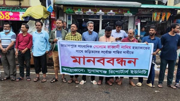 জামালপুরের সাংবাদিক গোলাম রব্বানী নাদিম হত্যাকারীদের সর্বোচ্চ শাস্তির দাবীতে মানববন্ধন করেছে সুনামগঞ্জ রিপোর্টার্স ইউনিটি। মঙ্গলবার (২০ জুন) দুপুরে সুনামগঞ্জ ট্রাফিক পয়েন্টে এ মানববন্ধন অনুষ্ঠিত হয়। ঘণ্টাব্যাপী মানববন্ধন চলাকালে বক্তব্য রাখেন,