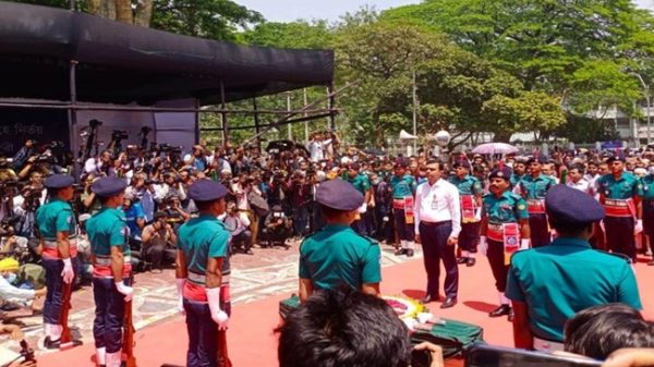 বীর মুক্তিযোদ্ধা ও গণস্বাস্থ্য কেন্দ্রের প্রতিষ্ঠাতা জাফরুল্লাহ চৌধুরীকে শহীদ মিনারে গার্ড অব অনার জানানো হয়েছে। বৃহস্পতিবার (১৩ এপ্রিল) বেলা সাড়ে বারোটায় ঢাকা জেলা প্রশাসকের পক্ষে অতিরিক্ত জেলা প্রশাসক এ কে