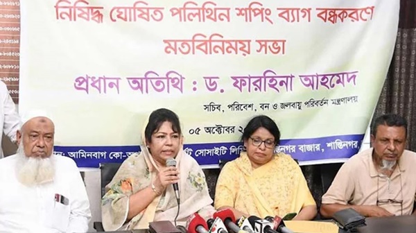 পরিবেশ, বন ও জলবায়ু পরিবর্তন সচিব ড. ফারহিনা আহমেদ জানিয়েছেন, ১ নভেম্বর থেকে পলিথিন শপিং ব্যাগের উৎপাদনকারীদের বিরুদ্ধে অভিযান শুরু হবে। শনিবার (৫ অক্টোবর) নিষিদ্ধ ঘোষিত পলিথিন শপিং ব্যাগ বন্ধকরণে