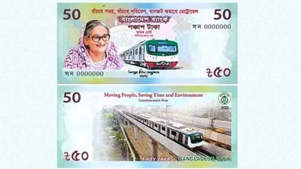 বাংলাদেশের প্রথম উড়াল মেট্রোরেলের উদ্বোধন উপলক্ষ্যে বাংলাদেশ ব্যাংক ৫০ টাকা মূল্যমানের একটি স্মারক নোট মুদ্রণ করেছে। প্রধানমন্ত্রী শেখ হাসিনা কাল মেট্রোরেল উদ্বোধনী অনুষ্ঠানে এই স্মারক নোটটি আনুষ্ঠানিকভাবে অবমুক্ত করবেন। মঙ্গলবার