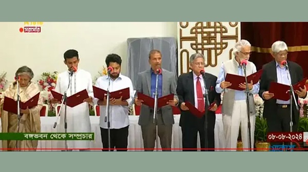 প্রধান উপদেষ্টা হিসেবে অর্থনীতিবিদ ড. মুহাম্মদ ইউনূসের শপথ গ্রহণের পর অন্তর্র্বতীকালীন সরকারের ১৩ উপদেষ্টাও শপথ নিয়েছেন। বৃহস্পতিবার (৮ আগস্ট) রাত সাড়ে ৯টার দিকে বঙ্গভবনে তাদের শপথবাক্য পাঠ করান রাষ্ট্রপতি মো.