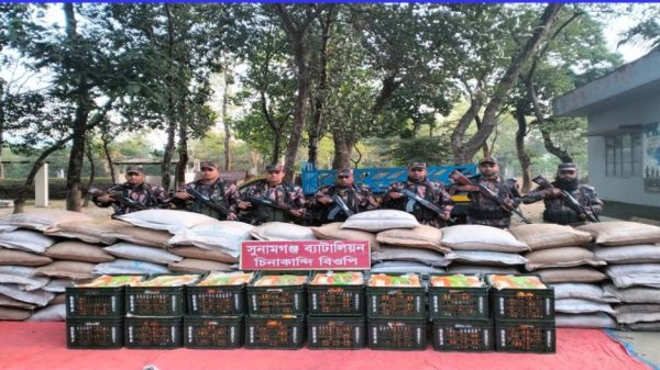 সুনামগঞ্জে সীমান্তের বিভিন্ন এলাকায় অভিযান চালিয়ে ভারতীয় গরু, চিনি, কয়লা শুটকি, কমলা, মদ, বিয়ারসহ বিভিন্ন মালামাল জব্দ করেছে সুনামগঞ্জ ২৮ বিজিবি’র সদস্যরা। রোববার দিবাগত রাত হতে আজ সোমবার সকাল পর্যন্ত