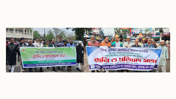 সুনামগঞ্জে জেলা প্রশাসন, কনজুমার এসোসিয়েশন অব বাংলাদেশ(ক্যাব) সুনামগঞ্জ জেলা কমিটির উদ্যোগে পৃথক পৃথকভাবে পালিত হয়েছে বিশ্ব ভোক্তা-অধিকার দিবস। দিবসটি উপলক্ষ্যে রোববার (১৫ মার্চ) সকালে জেলা প্রশাসন র্যালি ও আলোচনা সভা
