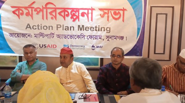 ডেমোক্রেসি ইন্টারন্যাশনার-এর অনুপ্রেরনায় গঠিত সুনামগঞ্জ মাল্টিপার্টি এডভোকেসি ফোরামের কর্ম পরিকল্পনা সভা অনুষ্ঠিত হয়েছে। সোমবার (২৫ মার্চ) বিকলে ৫ টায় সুনামগঞ্জ শহরের একটি অভিজাত রেস্টুরেন্টে এ সভা অনুষ্ঠিত হয়। সংগঠনের সভাপতি
