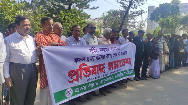 হাওরের ফসল রক্ষা বাঁধের কাজ বর্ধিত সময়েও শেষ না হওয়ার প্রতিবাধে সুনামগঞ্জে সমাবেশ করেছে হাওর বাচাঁও আন্দোলন কমিটি। বৃহস্পতিবার (৭ মার্চ) সকাল ১০টায় সুনামগঞ্জ জেলা কালেক্টরেট চত্বরে এ প্রতিবাদ সমাবেশ